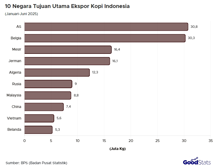 Ekspor kopi Indonesia pada semester I 2025 mencapai 206,7 ribu ton dengan nilai hampir US$1,13 miliar, dan diproyeksikan tumbuh 10% hingga akhir tahun. Amerika Serikat, Belgia, dan Mesir menjadi pasar utama.